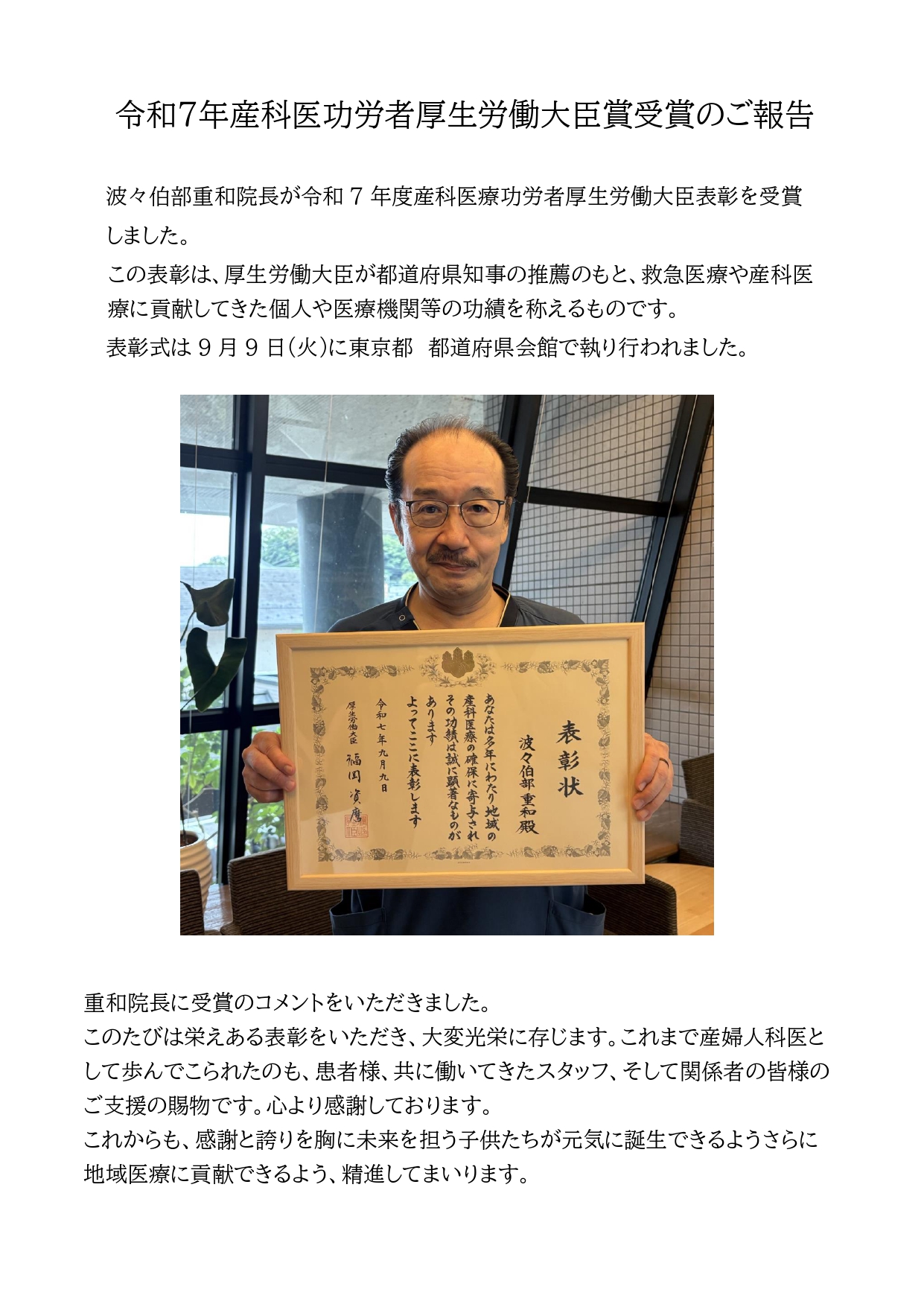 INFORMATION お知らせ About Clinic クリニックについて News お知らせ・情報 お知らせ マザークラス おめでたエピソード 採用情報 For First Visitor 初めて受診される方へ About Obstetrics 産科について About Gynecology 婦人科について Reserve 診療予約 お知らせ 2025.09.25 令和7年度 産科医功労者厚生労働大臣賞受賞のご報告