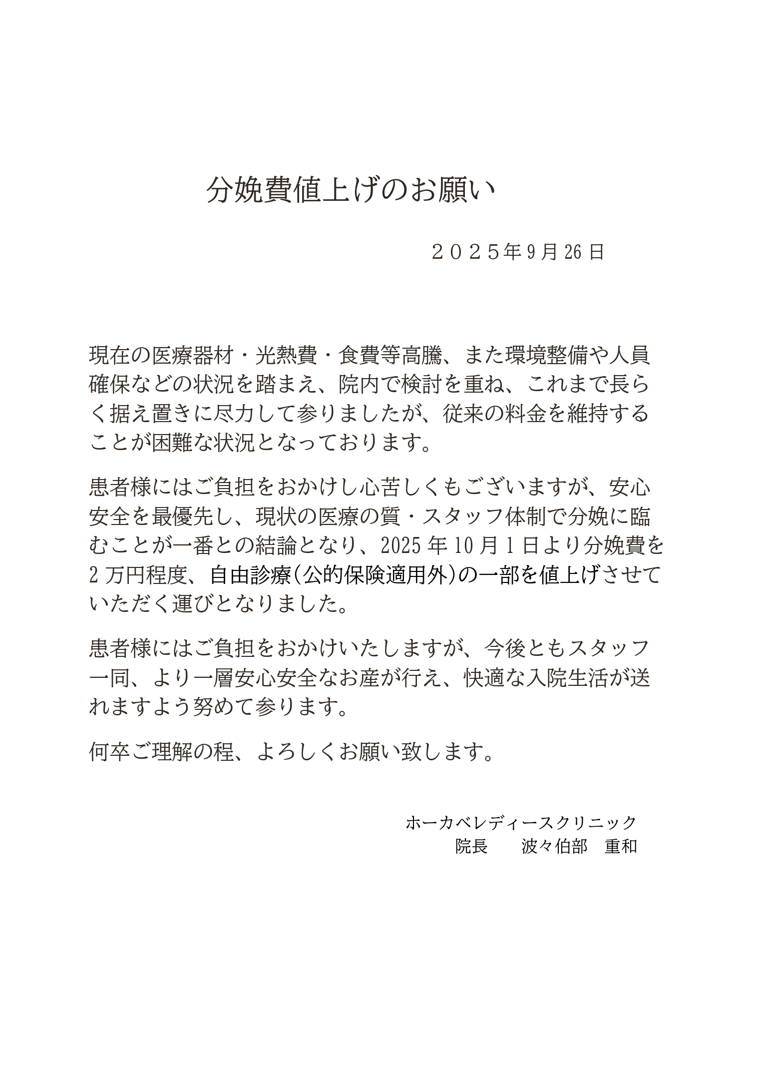 INFORMATION お知らせ About Clinic クリニックについて News お知らせ・情報 お知らせ マザークラス おめでたエピソード 採用情報 For First Visitor 初めて受診される方へ About Obstetrics 産科について About Gynecology 婦人科について Reserve 診療予約 お知らせ 2025.09.26 分娩費値上げのお願い