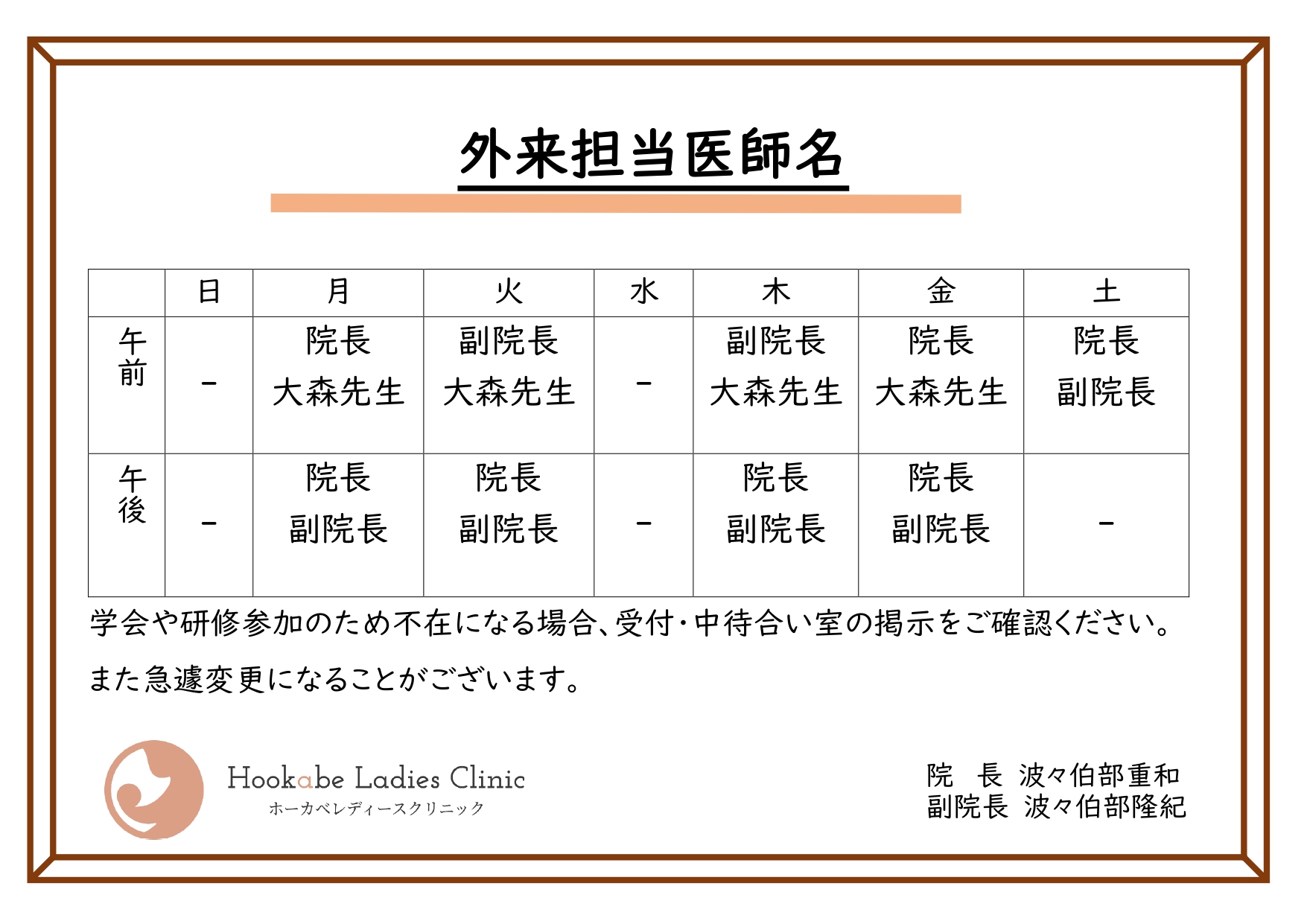INFORMATION お知らせ About Clinic クリニックについて News お知らせ・情報 お知らせ マザークラス おめでたエピソード 採用情報 For First Visitor 初めて受診される方へ About Obstetrics 産科について About Gynecology 婦人科について Reserve 診療予約 お知らせ 2025.11.07 📢外来担当医のご案内💁