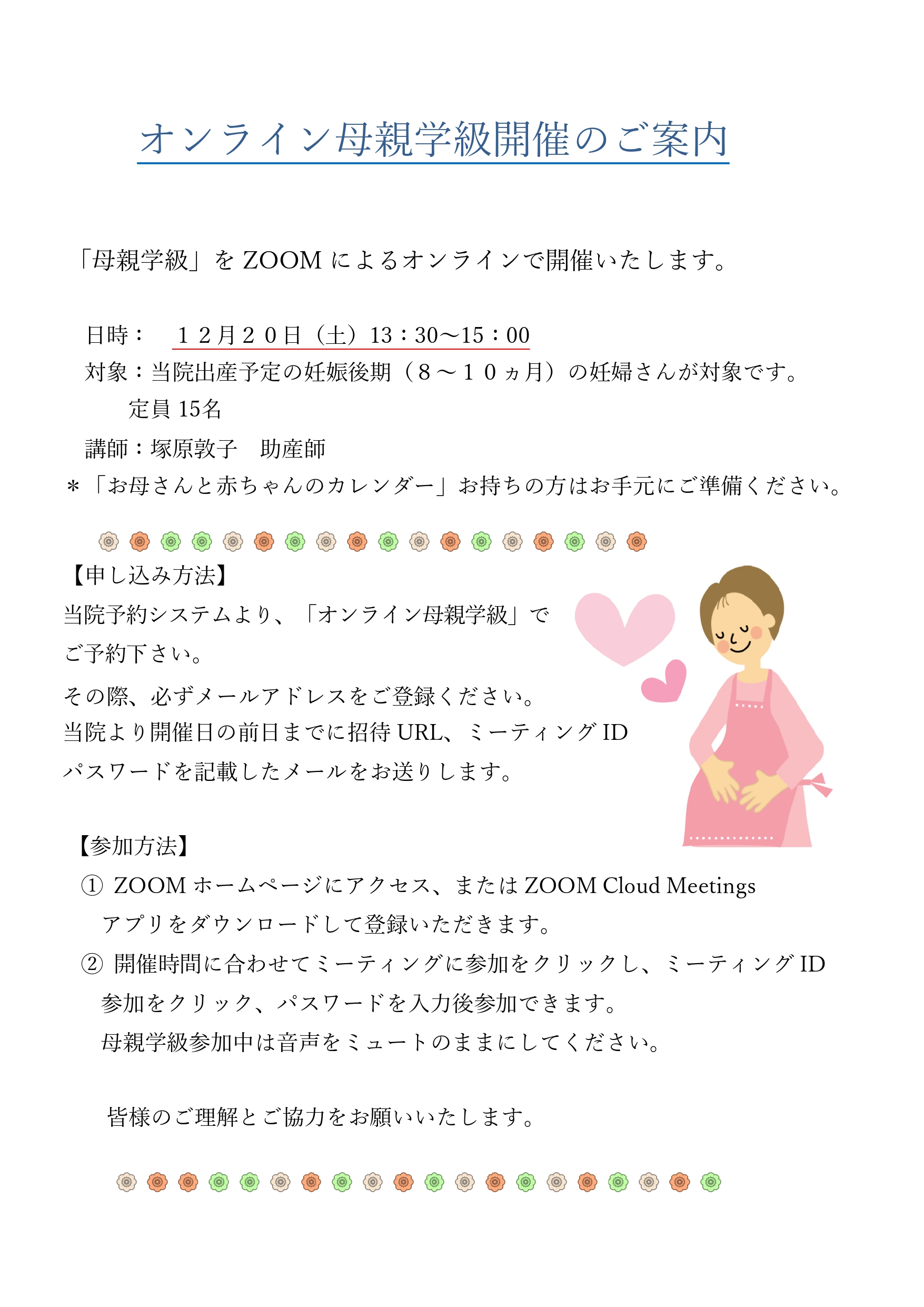 INFORMATION お知らせ About Clinic クリニックについて News お知らせ・情報 お知らせ マザークラス おめでたエピソード 採用情報 For First Visitor 初めて受診される方へ About Obstetrics 産科について About Gynecology 婦人科について Reserve 診療予約 お知らせ 2025.12.01 🏫「オンライン母親学級」2025年12月度のお知らせ🏫