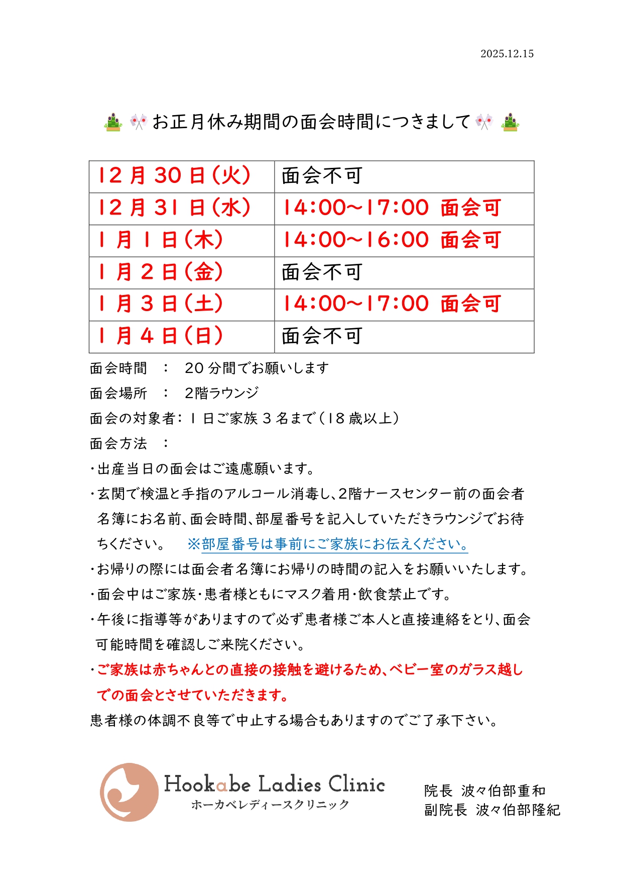 INFORMATION お知らせ About Clinic クリニックについて News お知らせ・情報 お知らせ マザークラス おめでたエピソード 採用情報 For First Visitor 初めて受診される方へ About Obstetrics 産科について About Gynecology 婦人科について Reserve 診療予約 お知らせ 2025.12.15 🎍年末年始期間の面会時間につきまして🐎