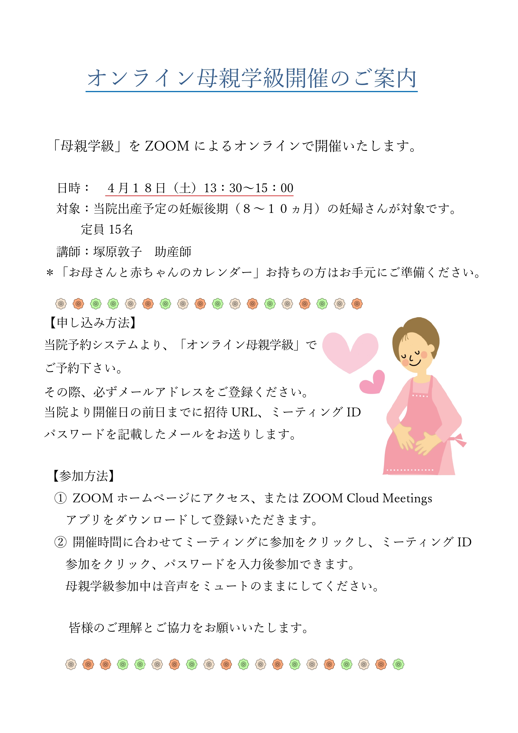 INFORMATION お知らせ About Clinic クリニックについて News お知らせ・情報 お知らせ マザークラス おめでたエピソード 採用情報 For First Visitor 初めて受診される方へ About Obstetrics 産科について About Gynecology 婦人科について Reserve 診療予約 お知らせ 2026.04.08 🏫「オンライン母親学級」2026年4月度のお知らせ🏫