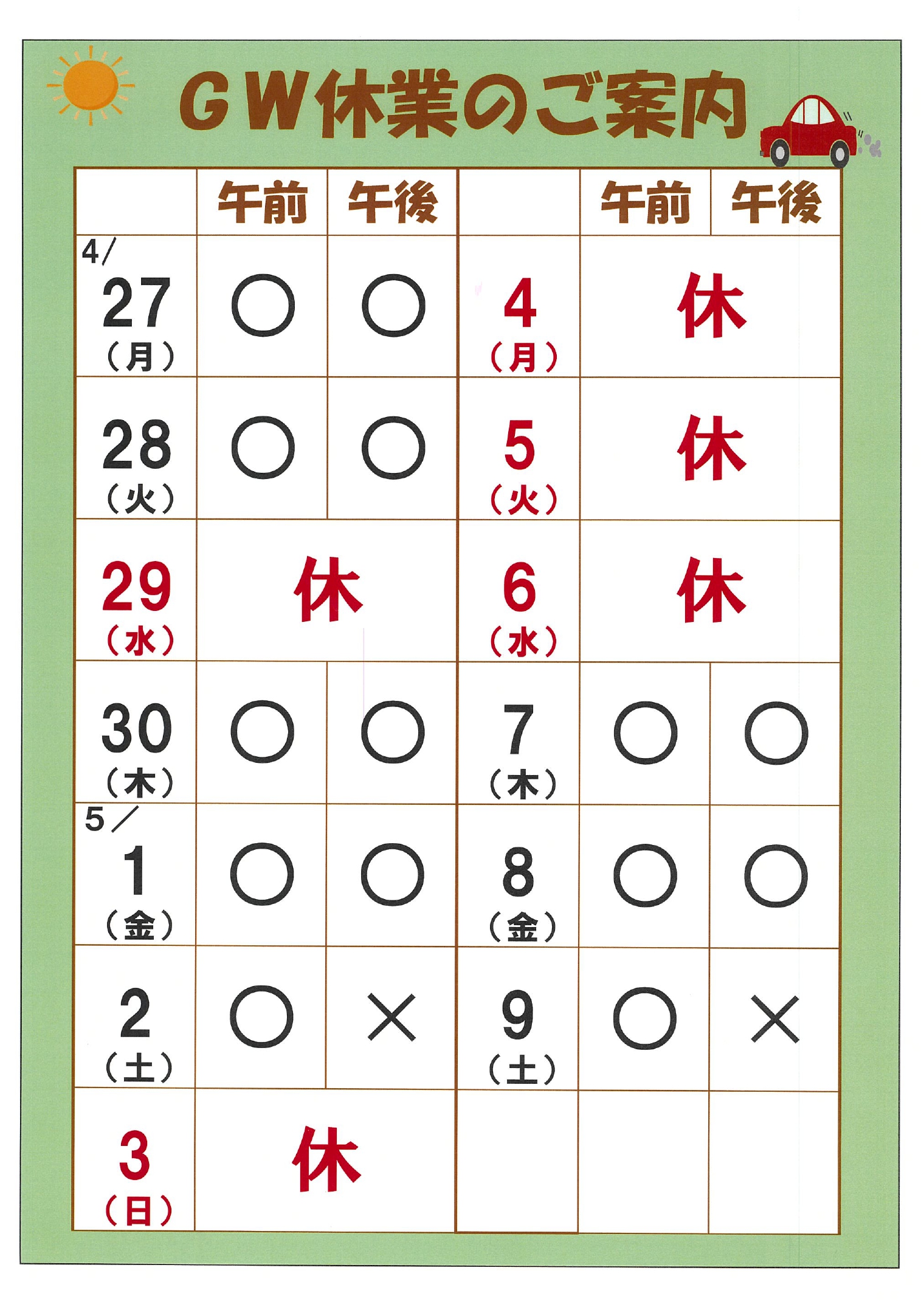 INFORMATION お知らせ About Clinic クリニックについて News お知らせ・情報 お知らせ マザークラス おめでたエピソード 採用情報 For First Visitor 初めて受診される方へ About Obstetrics 産科について About Gynecology 婦人科について Reserve 診療予約 お知らせ 2026.04.28 GW休業のご案内✨